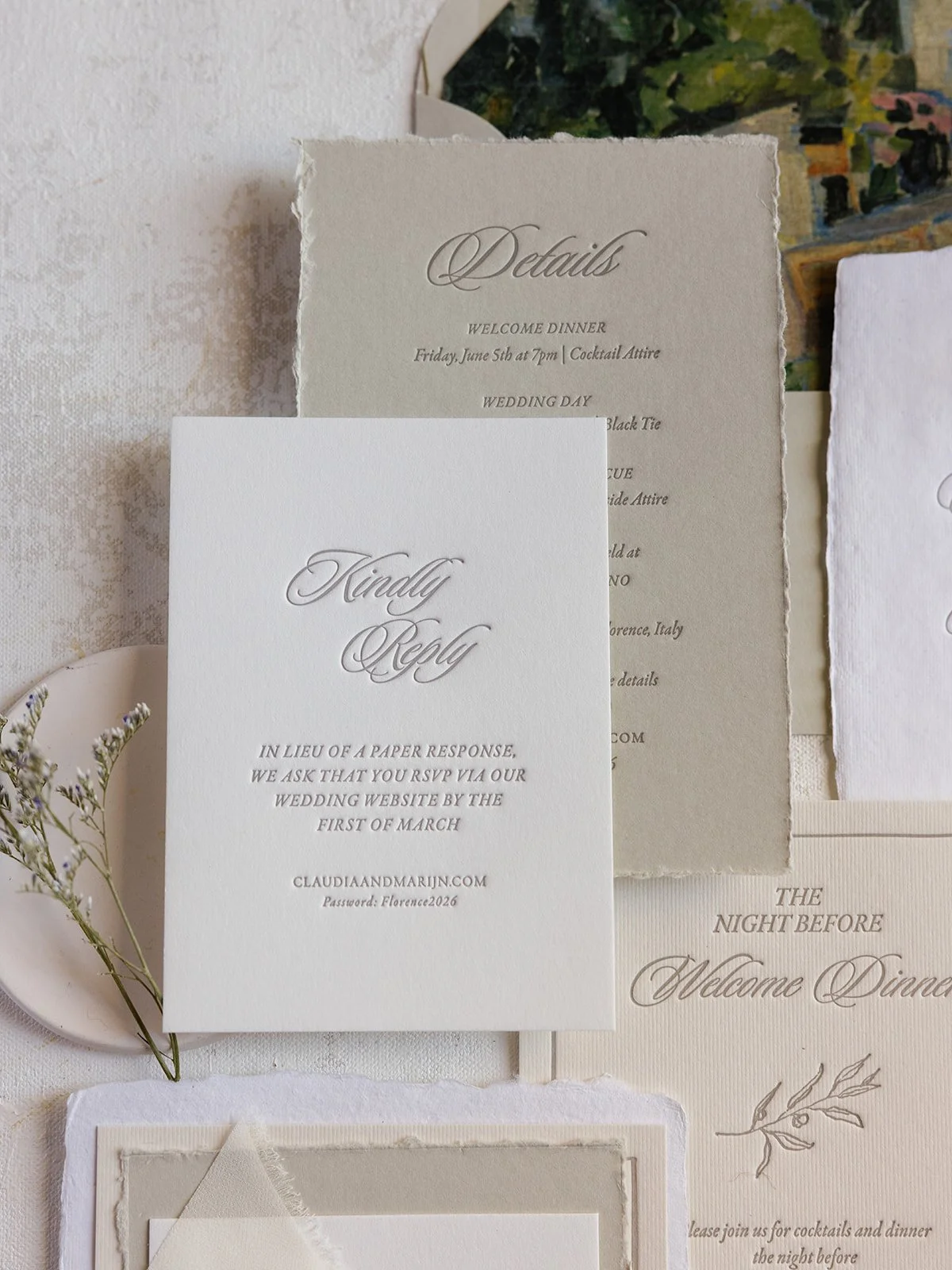 We strongly recommend mailing your invitation out 8-10 weeks prior to your wedding date. We call this the sweet suite spot to instill a sense of urgency in your guests (aka avoiding having it thrown in a drawer and forgotten about) while also giving your guests enough time to plan accordingly. For destination weddings, or if more than half of your guests are traveling more than 3 hours or hopping on a plane, you can add 4-8 weeks to this timeline.