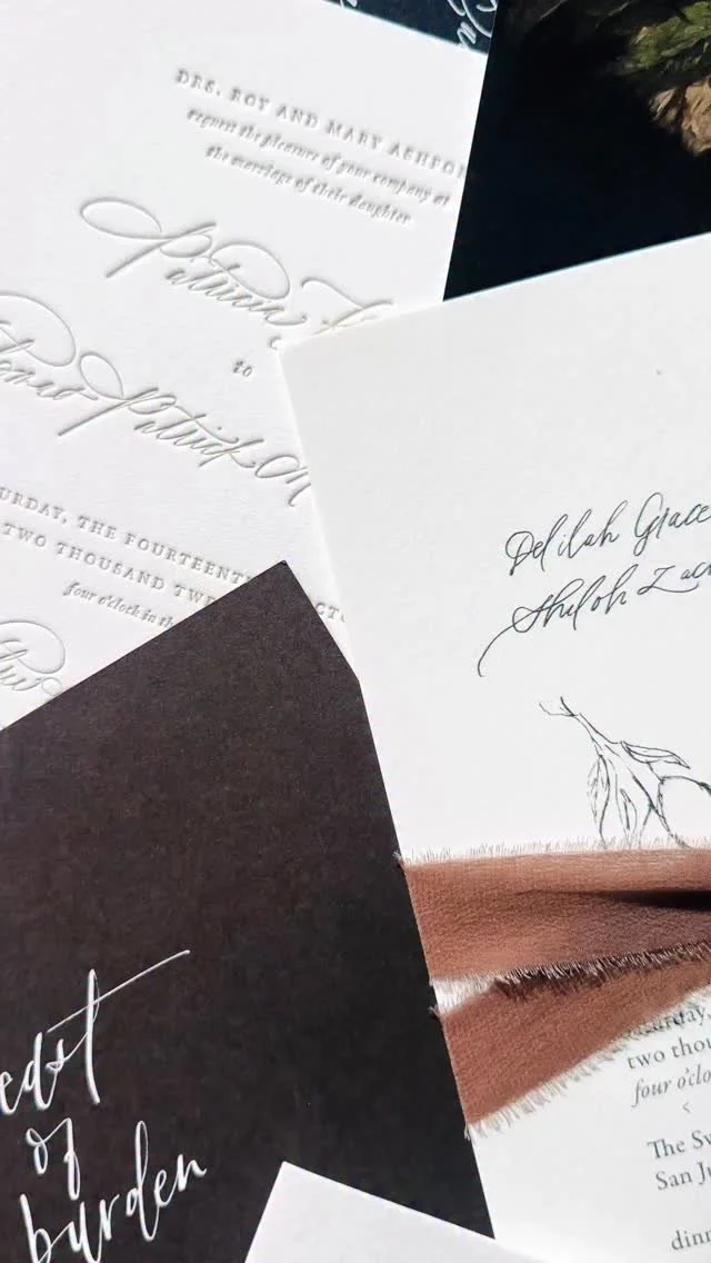 Ultimately, the choice between digital and letterpress printing comes down to your unique wedding paper needs and aesthetic preferences. Are you looking for a quicker turnaround? Digital printing is your go-to. Digitally printed Save the Dates can be in the mail to you within 2-3 weeks of approval and invitation suites as soon as 4-5 weeks. But if you crave a rich tactile experience with artisanal charm, then letterpress is surely your match. You’ll want to allow 5-6 weeks for letterpress suites including professional assembly.