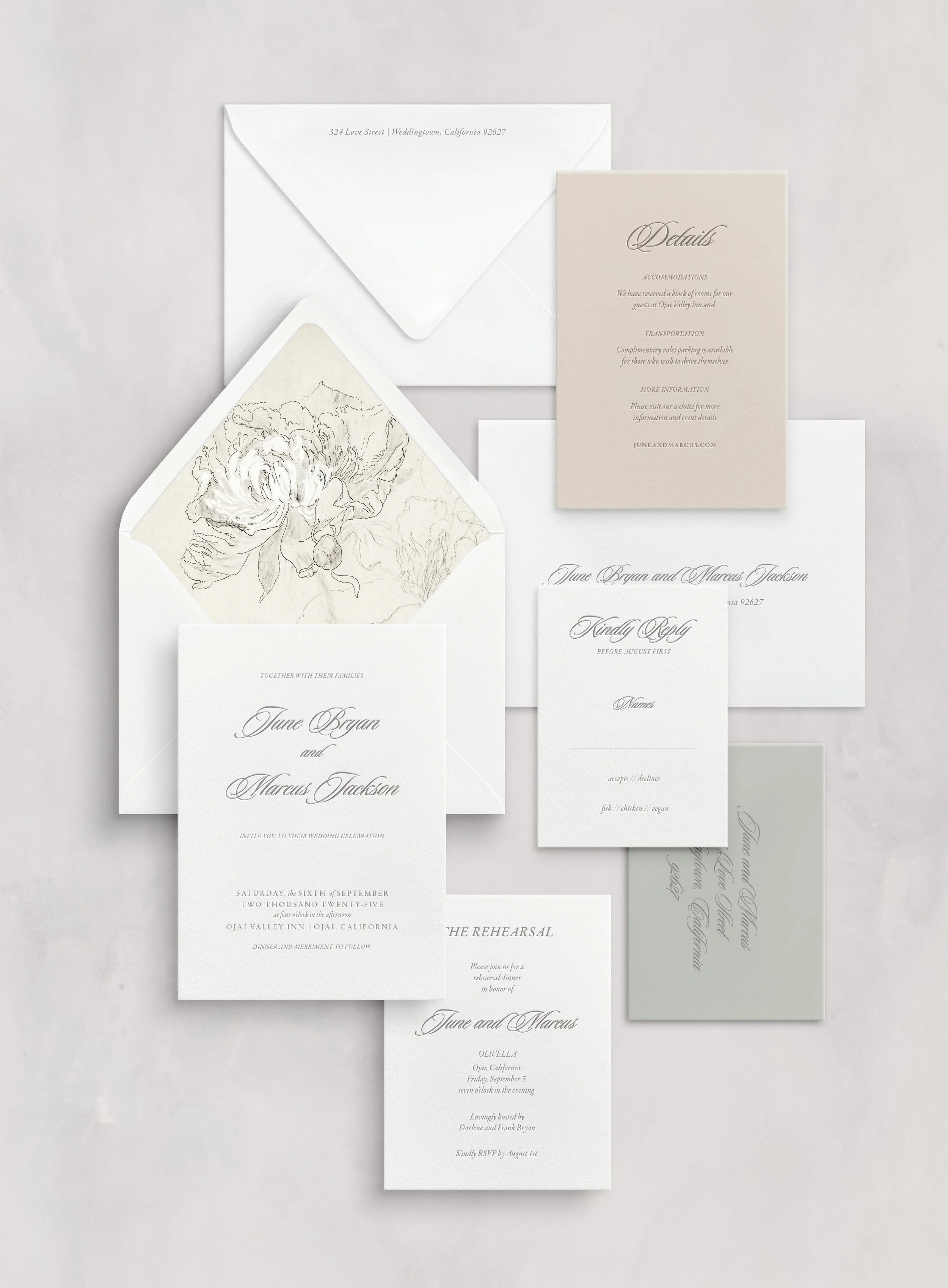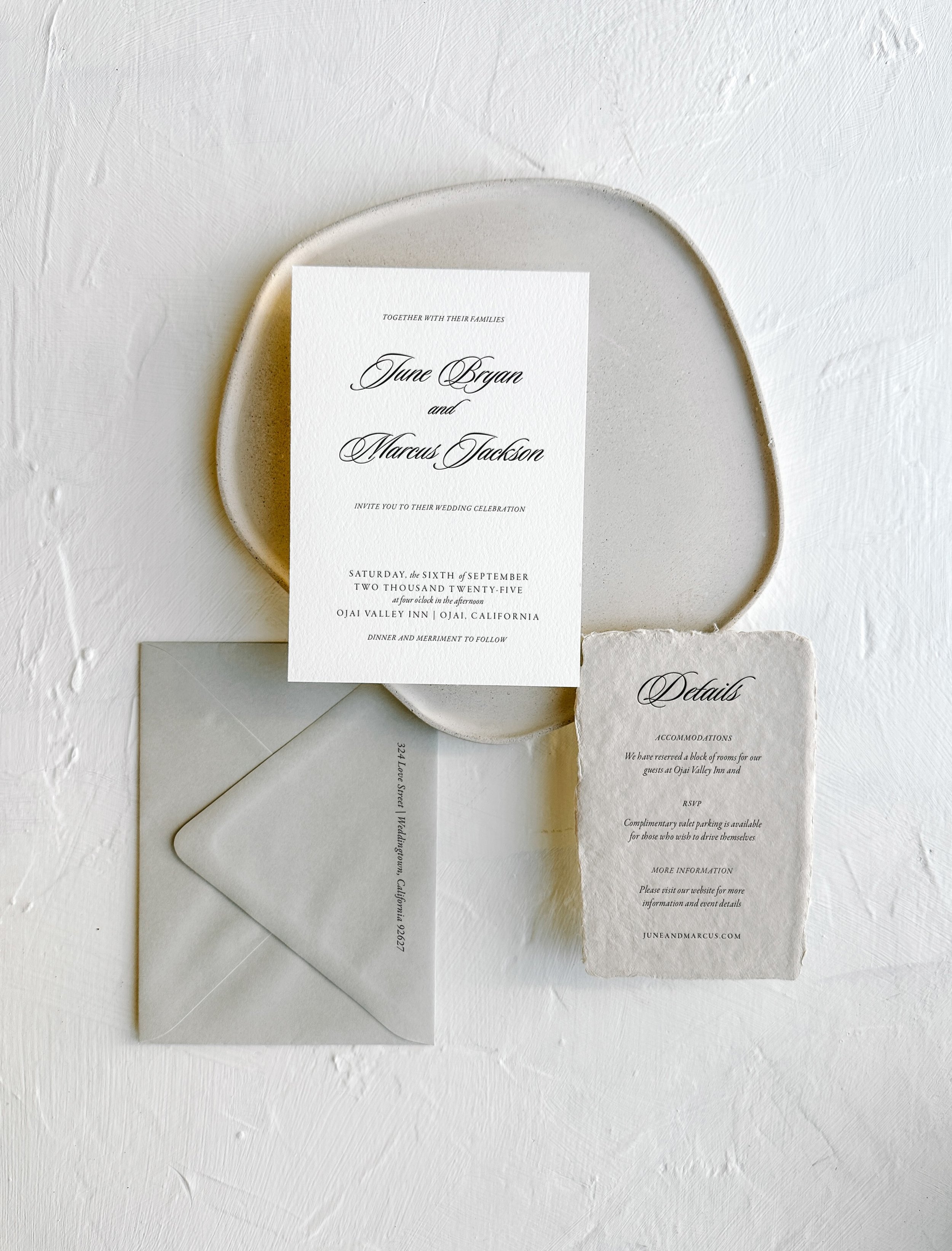 The June showcases a regal, romantic script paired with a clean aesthetic perfect for the modern couple looking to celebrate with an elevated flair. Check out our ordering guide to see the multitude of ways you can customize your design.