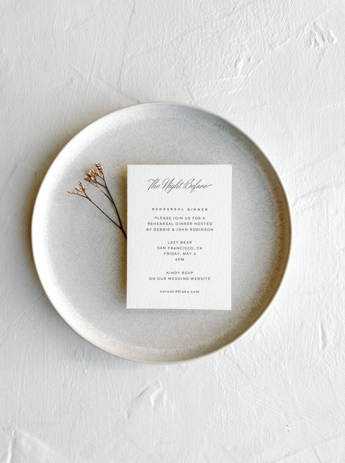 The Nora 5 piece suite with rehearsal card // Outer envelope in stone, response envelope in nude, rehearsal card in chocolate with white ink printing, Letterpress ink in Stone on soft white cotton main card and mail back rsvp card, letterpress ink in stone on light moss details card. Liner artwork no.