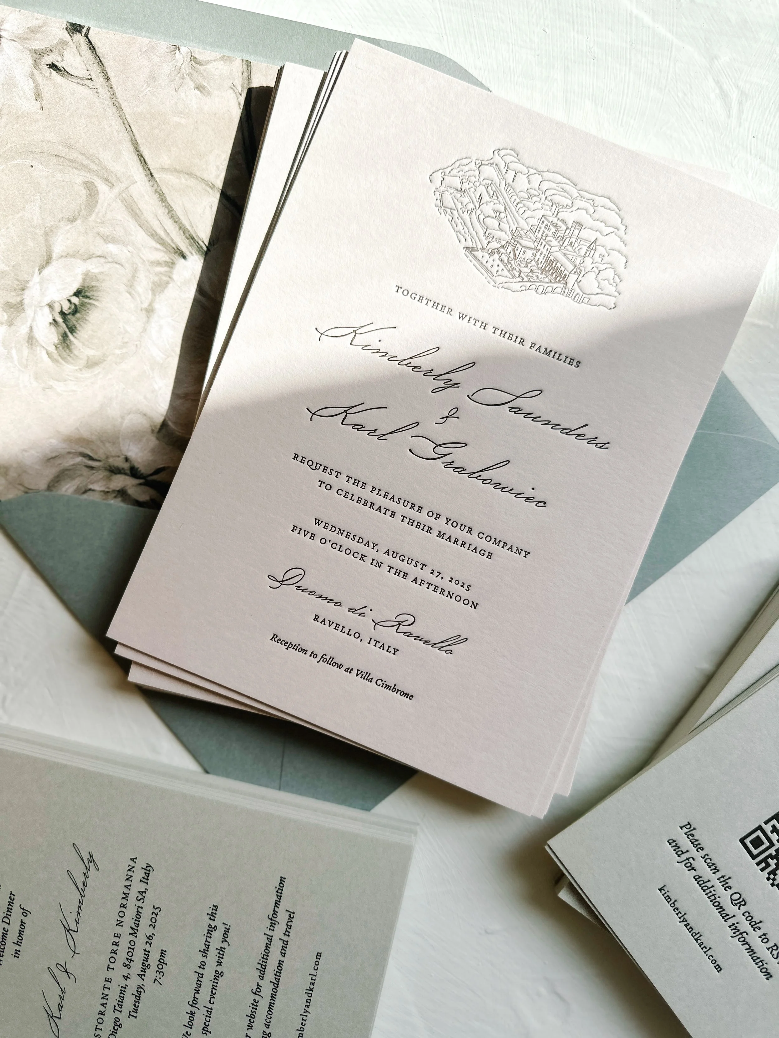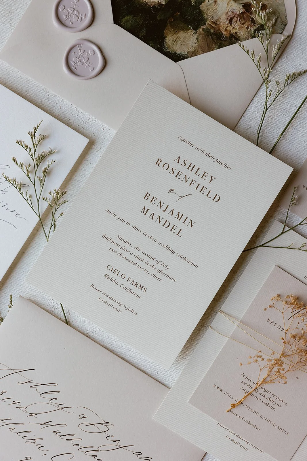 Designer tip: Choose a Collection design with a typeface and layout that you love as those elements will remain the same. Your suite will then be personalized with your specific wording and chosen color palette inside of your design questionnaire. See our Ordering Guide for curated options available.