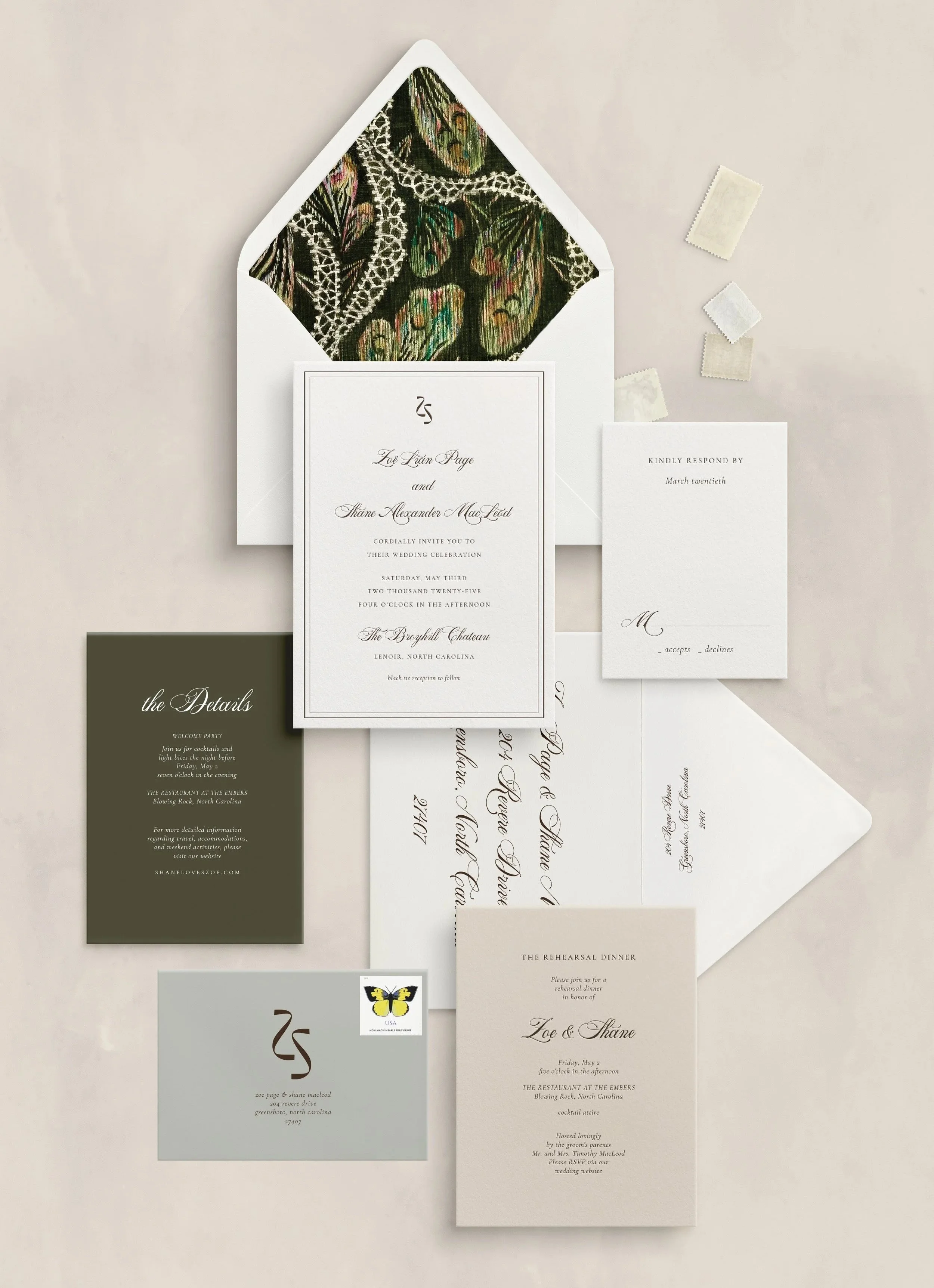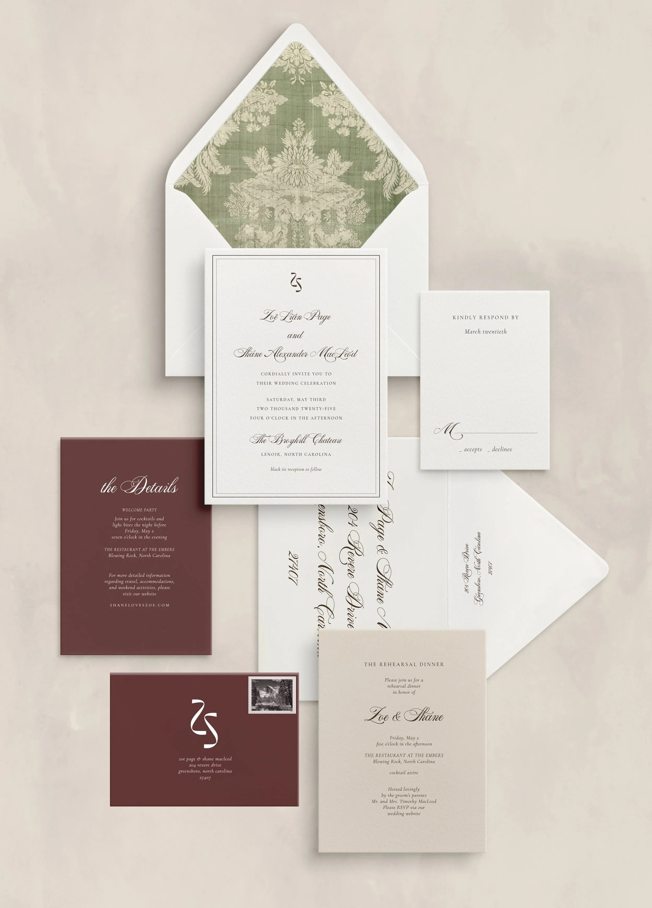 04 // You will customize your suite to your liking with your choice of: paper type, print method, text color, envelope color, and enhance with desired embellishments and design features.
